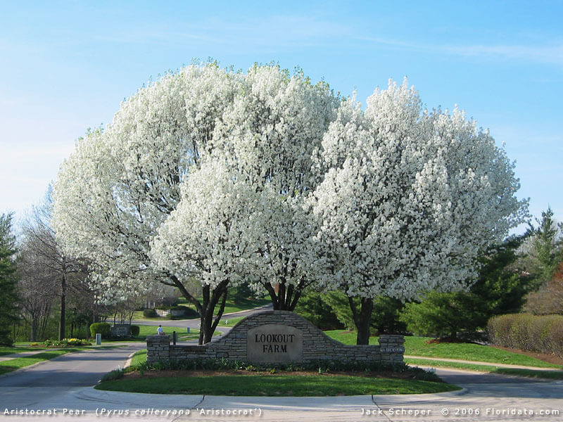 This deciduous is a pear tree grown for its flowers and fall foliage, and not for an edible fruit. The flowers appear before and with the leaves in early spring, and completely cover the tree so that all you see is white.
